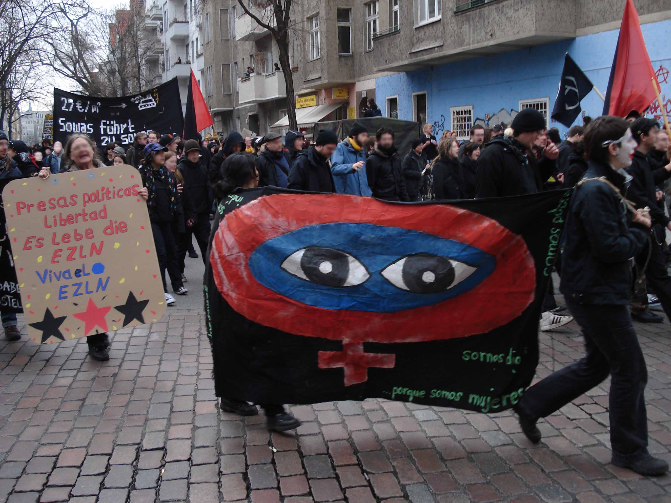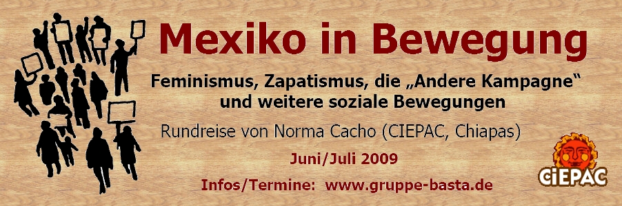 Am 14.3.2009 demonstrierten Aktivist_innen des Ya-Basta-Netz im Rahmen der Demonstration "Wir bleiben alle!" gegen die Repression in Mexiko und solidarisierten sich mit dem Kampf der EZLN und weiterer sozialer Bewegungen.=> Fotos auf Indymedia Chiapas [Dokumentation] - 14.11.-1.12.2008: Vortragsreise November/Dezember 2008: DAS ENGAGEMENT DER ANARCHISTS AGAINST THE WALL IN ISRAEL/PALÄSTINA [Dokumentation] - 5.-13.11.2008: Vortragsreise November 2008: DER KAMPF GEGEN REPRESSION IM KONTEXT VON ATENCO [Erklärung] - 28.7.-12.8.2008: INTERNATIONALE BEOBACHTUNGS- UND SOLIDARITÄTSKARAWANE IN CHIAPAS [Dokumentation] - 7.-12.4.2008: Vortragsreise April 2008: SCHLUSS MIT DER REPRESSION IN CHIAPAS [Dokumentation] - 15.2.2008: Internationaler Aktionstag: Schluss mit der Repression in Chiapas! Solidarität mit indigenen Autonomie! [Aufruf] - 28.12.2007-2.1.2008: Europaweites FrauenLesbenTreffen (deutsch & castellano & english & ...) [Brief] - 2.12.2007: Solidarität mit den Kämpfen der indigenen Bewegungen - ¡Solidaritat con las luchas de los movimientos indígenas! (deutsch & castellano) [Brief] - 1.12.2007: Schluss mit der Repression gegen die zapatistischen Gemeinden - ¡Alto a la represión en contra de las comunidades zapa tistas! (deutsch & castellano) [Fotos] - Juni 2007: Eindrücke vom Widerstand gegen den G8 Gipfel Anfang Juni 2007 in Heiligendamm, Mecklenburg-Vorpommern, BRD [Brief] - 14.5.2007: EINLADUNG ZU ANTI-G8-PROTESTEN - INVITACIÓN A LAS PROTESTAS ANTI-G8 (deutsch & castellano) [Dokumentation] - 2006/2007: KARAWAHNSINN - Mobilisierung gegen den G8-"Gipfel" (mehrsprachig) [Redebeiträge & Fotos] - Am 22. September 2006 fand vor dem mexikanischen Konsulat in Frankfurt/Main eine Protestkundgebung unter dem Motto "Schluss mit der Repression in Mexiko! Für Menschenrechte und Demokratie!" statt. [Brief] - Statement des YA-BASTA-NETZ vom 18.9.2006 zum nächsten "Intergalactico" gegen Neoliberalismus und für die Menschheit [Bericht & Fotos] - Am 12. Mai 2006 fand im Rahmen des Gipfels von EU, Lateinamerika und Karibik in Wien eine Spontandemonstration gegen die menschenverachtende Polizeigewalt gegen die soziale Bewegung in San Salvador Atenco und die "Andere Kampagne" statt. Brief des YA-BASTA-NETZ an die zapatistische Bewegung (Januar 2006) [deutsch] - [castellano] [Bericht & Fotos] - Im August 2004 protestierten das YA-BASTA-NETZ und engagierte Einzelpersonen vor der mexikanischen Botschaft gegen die Repression in Mexiko [Bericht & Fotos] - Im Sommer 2000 protestierte das YA-BASTA-NETZ anlässlich des "Nationentags Mexiko" während der EXPO in Hannover Anmerkung: Diese Sektion ist keineswegs vollständig, weitere Berichte über Aktionen des Ya-Basta-Netz folgen... |